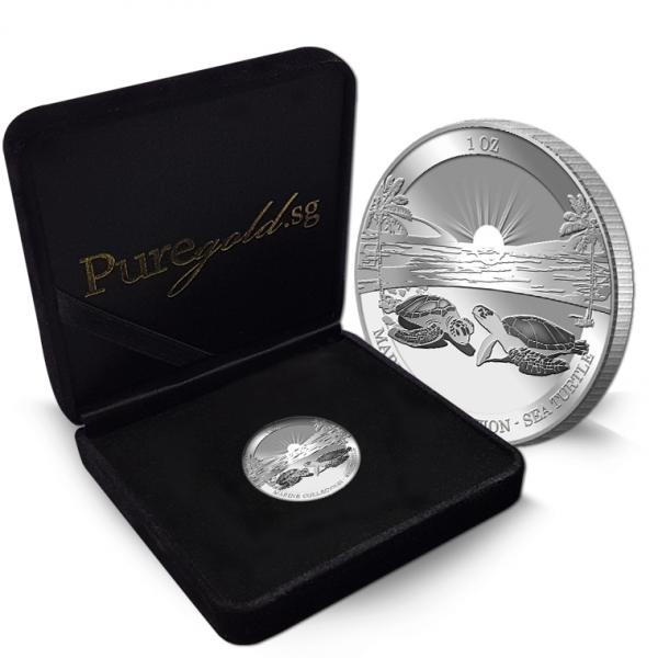 The image of the two sea turtles is embossed on a 1Oz 999 fine silver medallion.