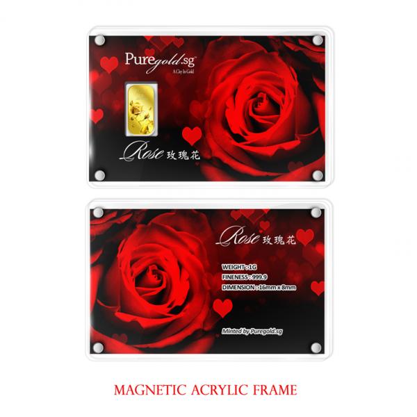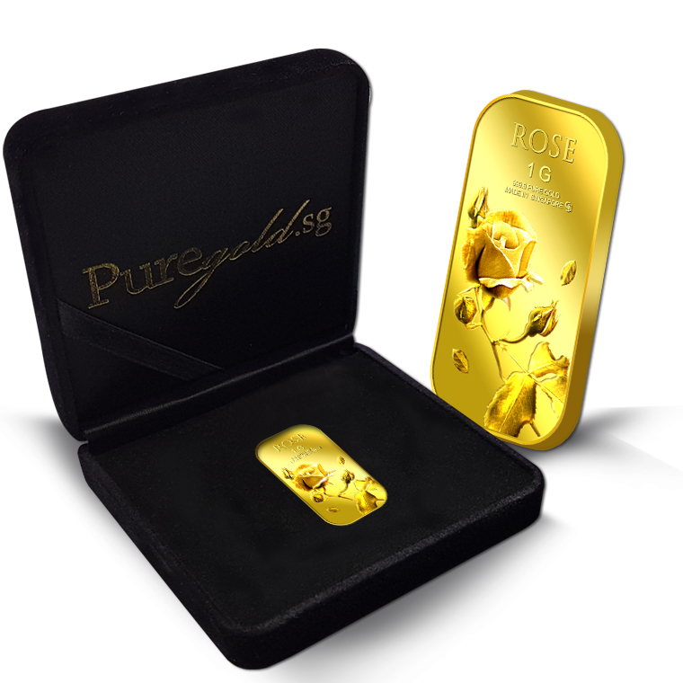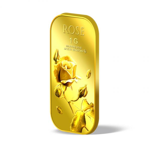 The image of the Rose is embossed on a 1g 999.9 fine gold bar.