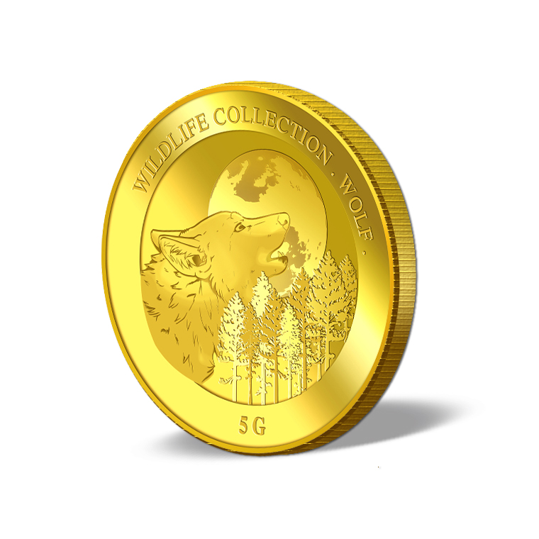 The image of a Wolf is embossed on a 5g 999.9 fine gold.