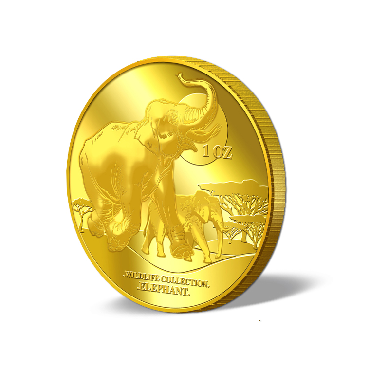 The Elephant gold Medallion design portrays an image of an Elephant. The design also includes the inscription WILDLIFE COLLECTION, ELEPHANT, the Medallion’s weight and fineness.