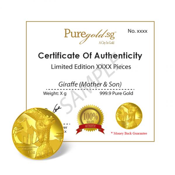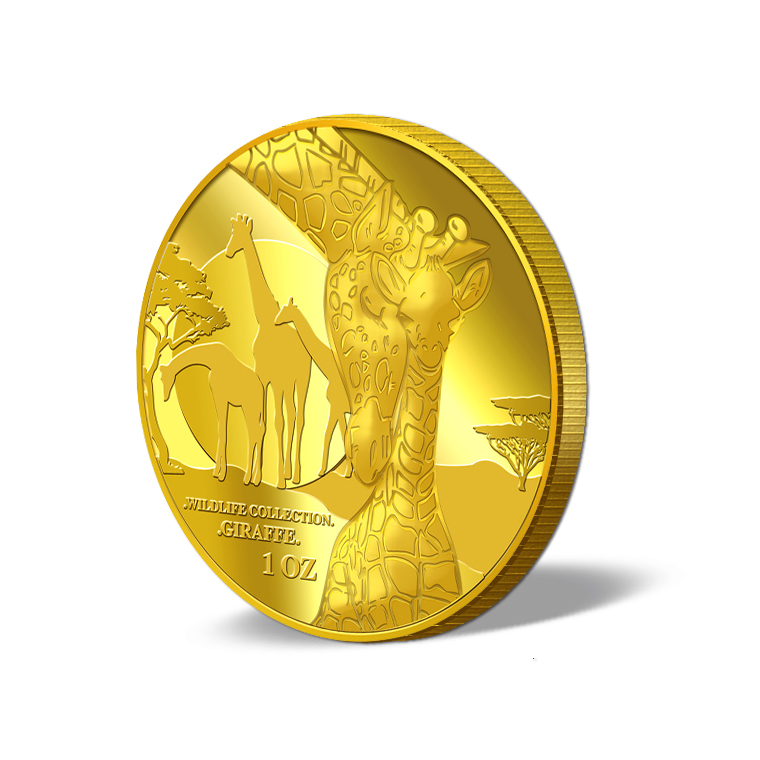 The Giraffe gold Medallion design portrays an image of a giraffe showing affection to its calf. The design also includes the inscription WILDLIFE COLLECTION, GIRAFFE and the Medallion’s weight.