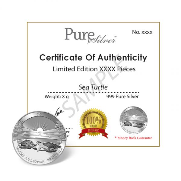 The image of the two sea turtles is embossed on a 5g 999 fine silver medallion.