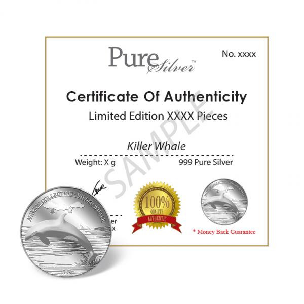 The image of the Killer Whale is embossed on a 5g 999 fine Silver medallion.