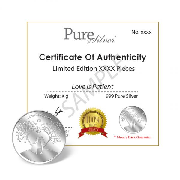 The Love is Patient silver medallion design portrays a beautiful image a groom and a bride.