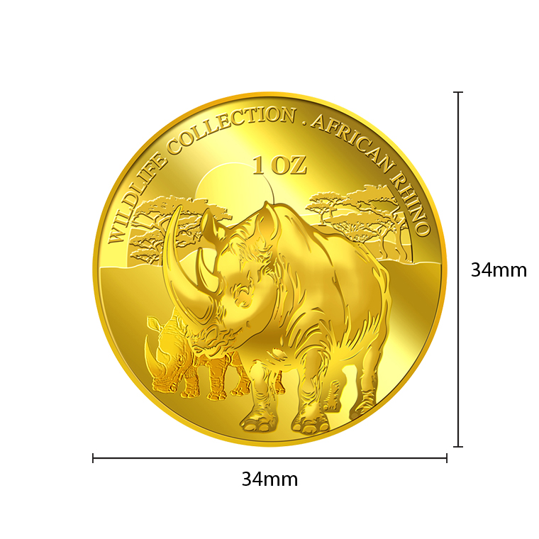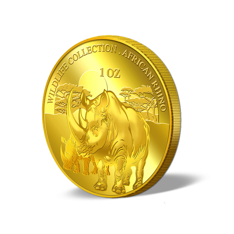 The Rhinoceros gold Medallion design portrays an image of a Rhino. The design also includes the inscription WILDLIFE COLLECTION, Rhinoceros, the Medallion’s weight and fineness.