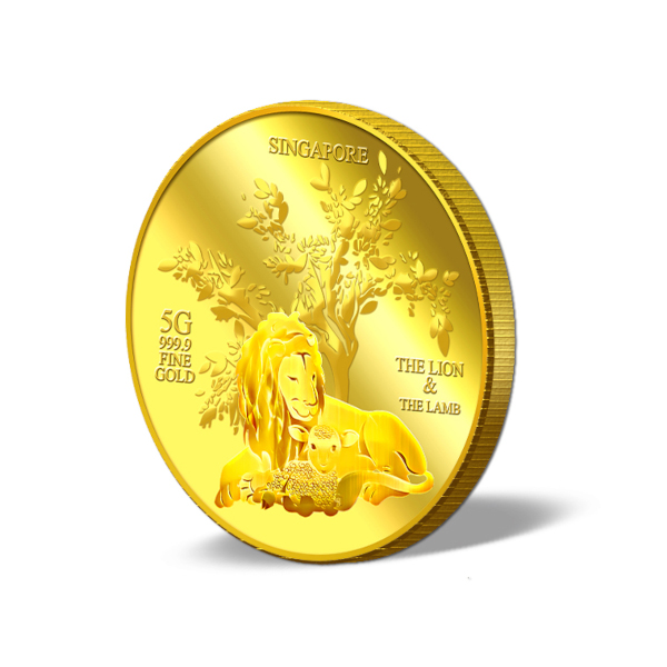 The Lion & The Lamb gold medallion design portrays a beautiful image of a lion and a lamb resting peacefully together in front of a tree. The design also includes the inscription THE LION & THE LAMB, SINGAPORE, the medallion’s weight and GoldSilver Refinery’s “GS” logo mark.