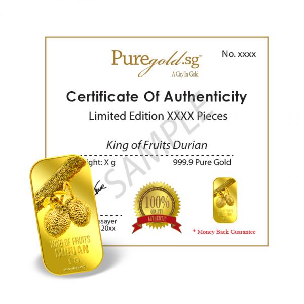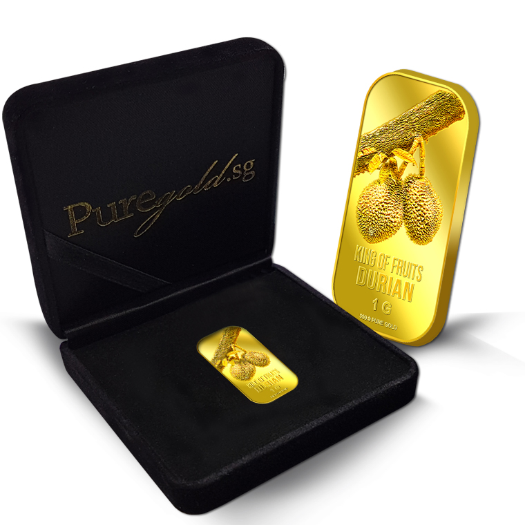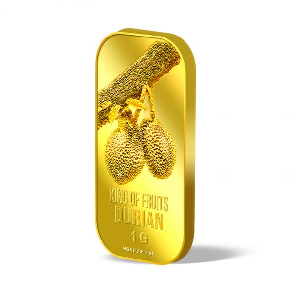 The image of the Durian is embossed on a 1g 999.9 fine gold bar.