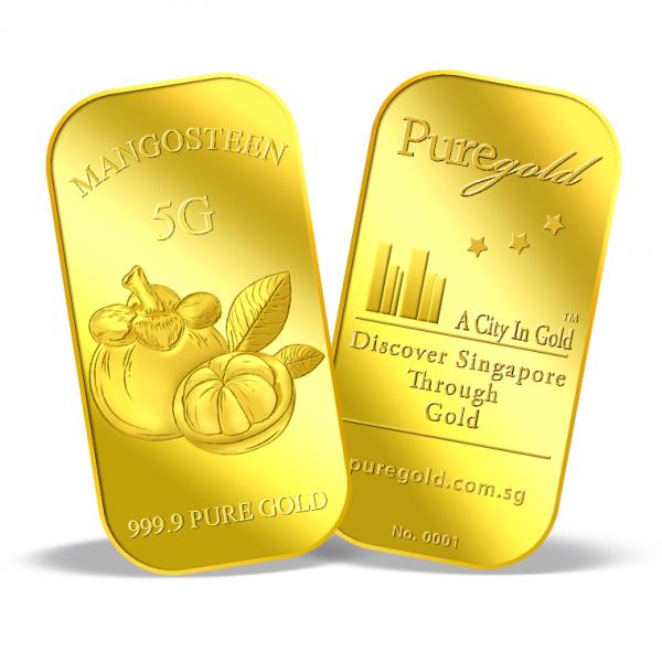 The image of the mangosteen is embossed on a 5g 999.9 fine gold bar.