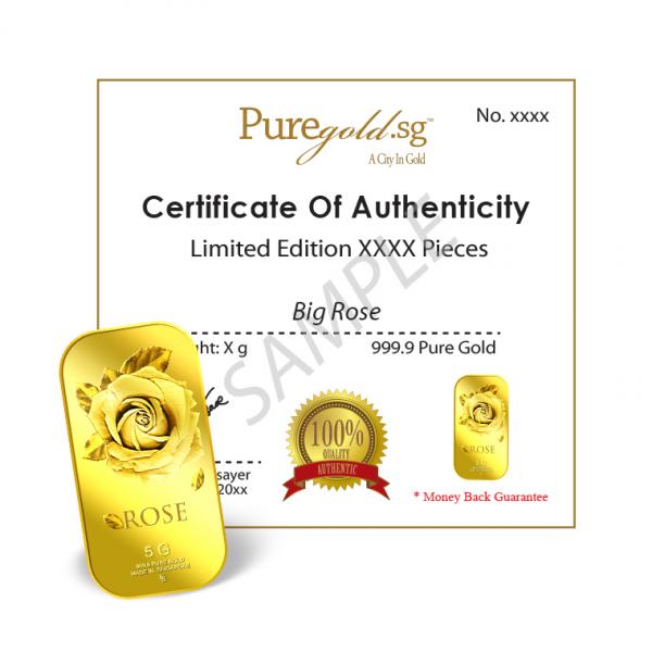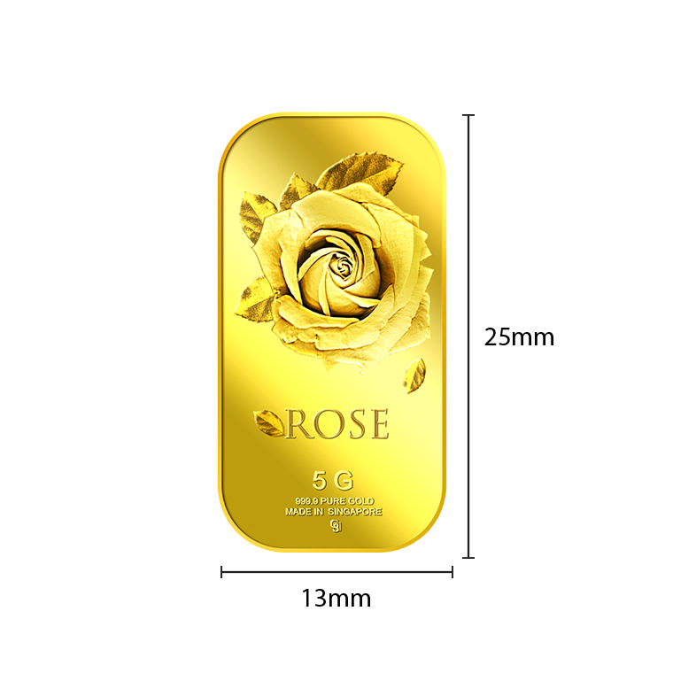 The image of the Big Rose is embossed on a 5g 999.9 fine gold bar.