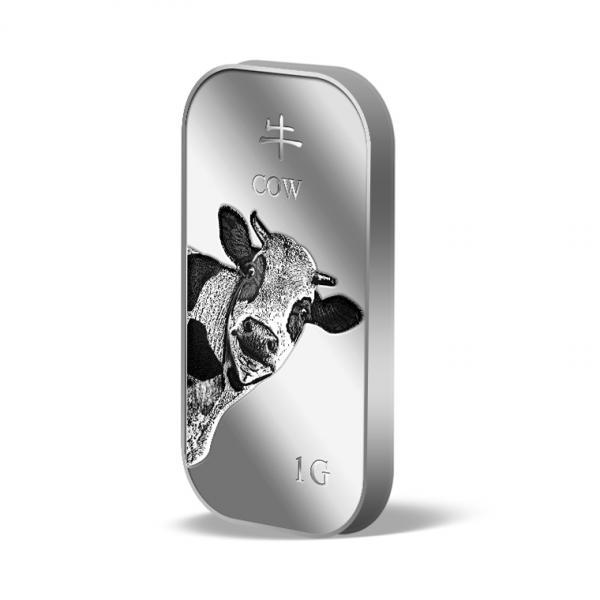 The image is embossed on a 1 gram 999 fine silver bar.