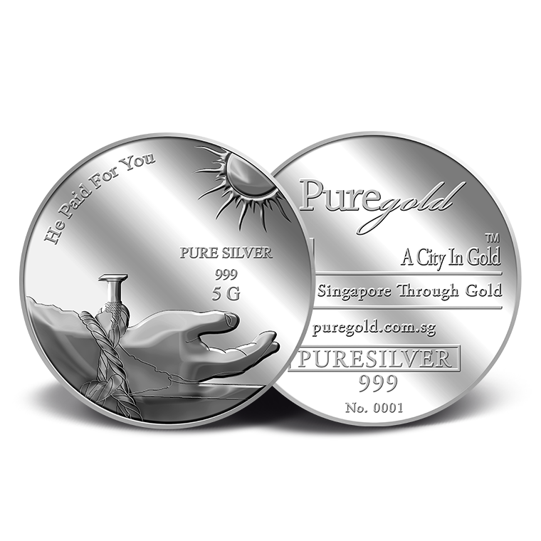 The "He Paid For You" silver medallion design portrays an image of Jesus' hand fastened to the wooden cross, and the rising sun which refers to the coming of the Lord Jesus Christ in power and great glory. The design also includes the inscription “He Paid For You", the medallion’s weight and fineness.