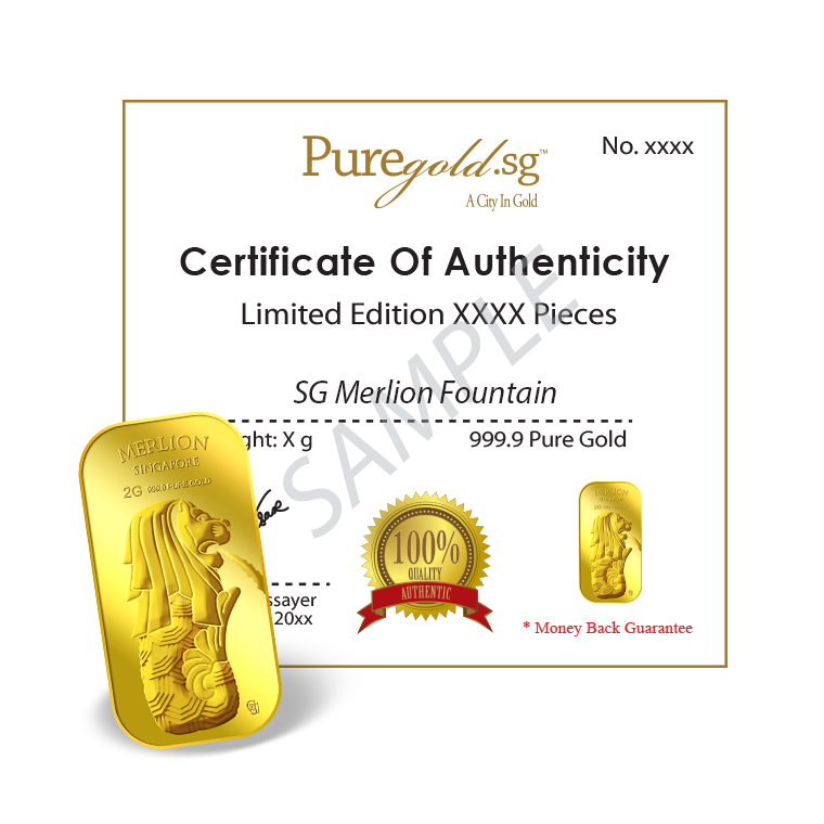 The new version of the Singapore Merlion gold bar design portrays Singapore’s national mascot, the Merlion, as a fountain with water gushing out from its mouth. The design also includes the inscription SINGAPORE «MERLION, the Medallion’s weight and fineness, and PureGold webpage address.