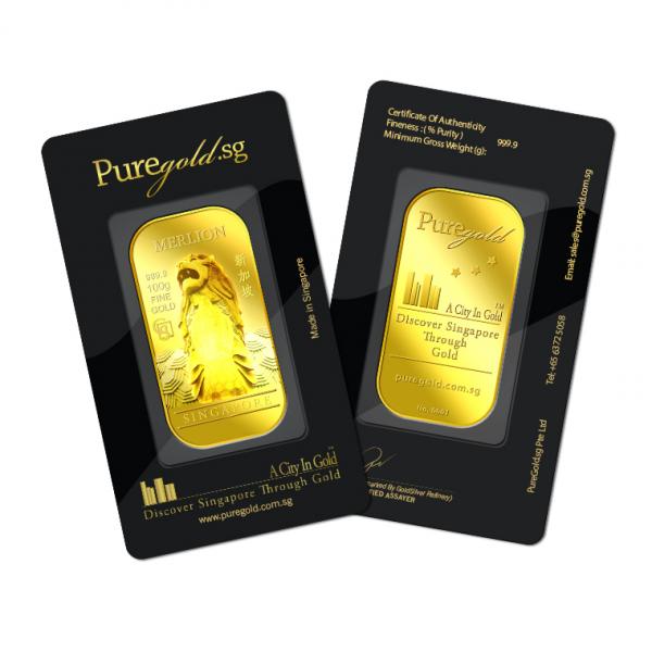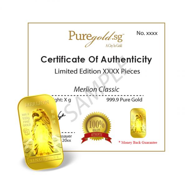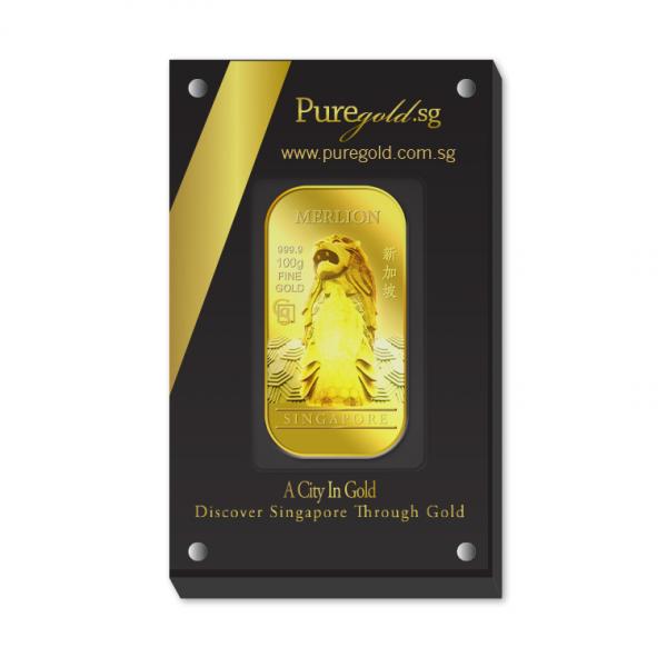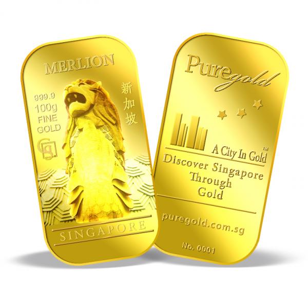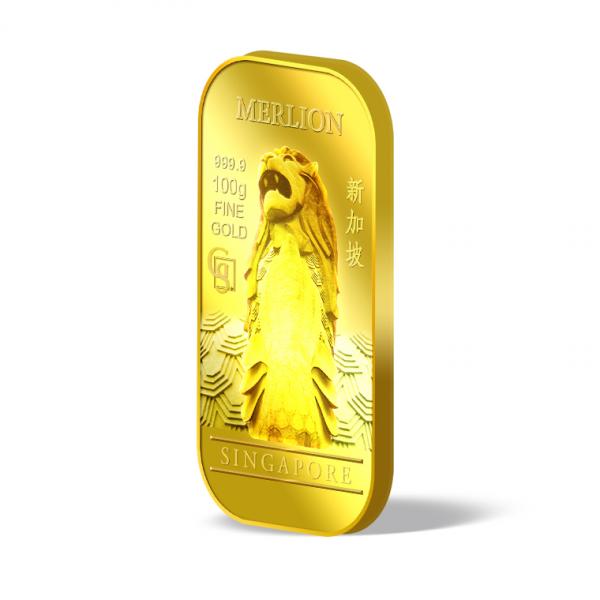 The images of Merlion are embossed on a 100g 999.9 fine gold bar.