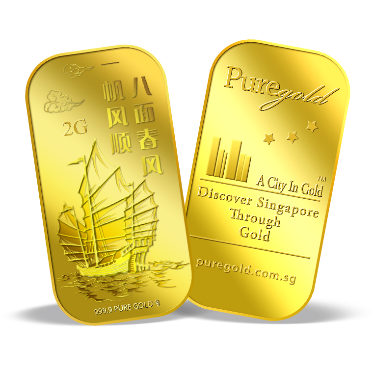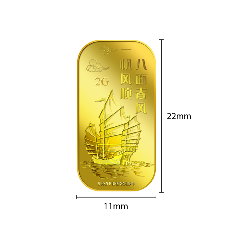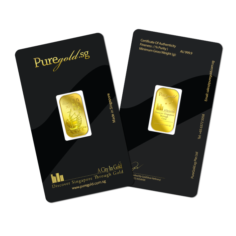 The image is embossed on a 2 grams 999.9 fine gold bar.