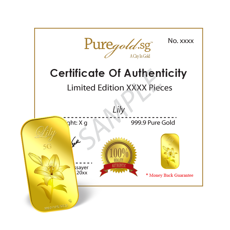 The image is embossed on a 5 grams 999.9 fine gold bar.