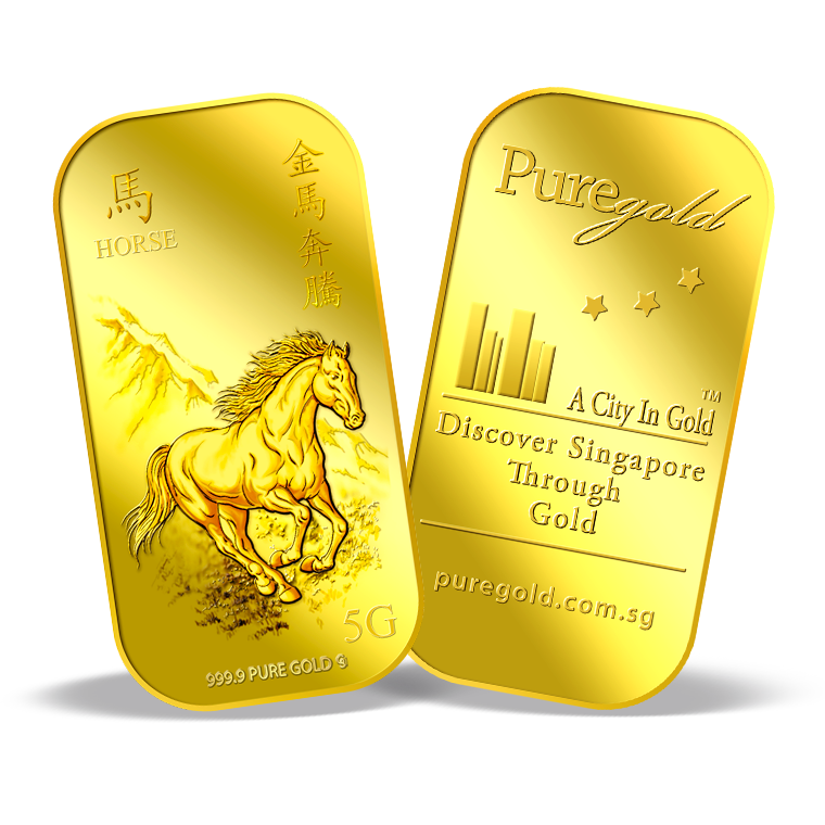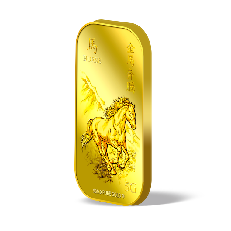 The image is embossed on a 5 grams 999.9 fine gold bar.