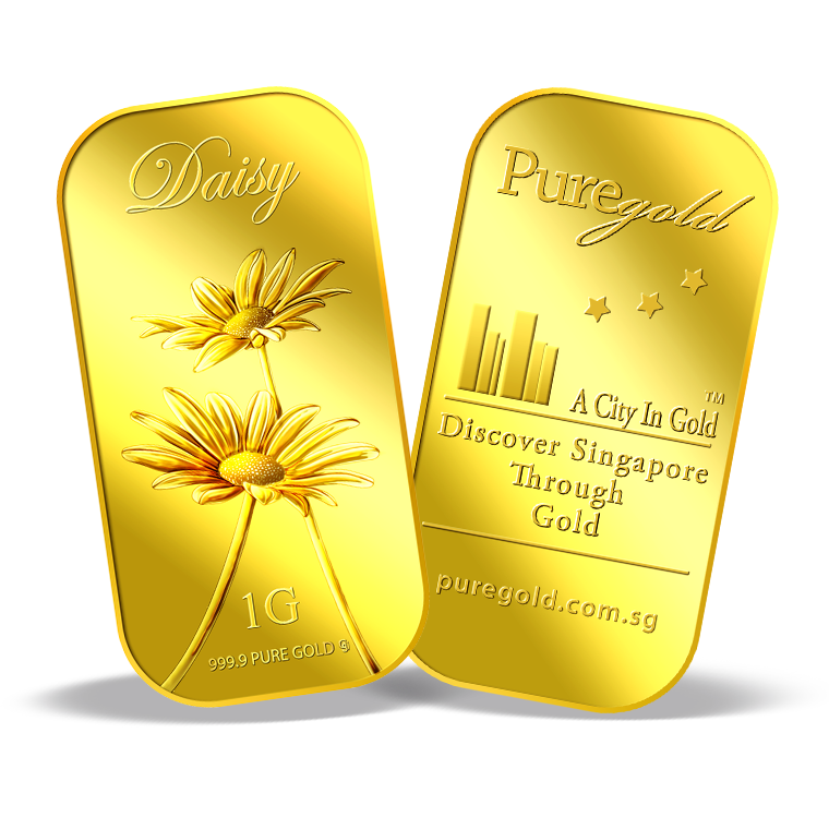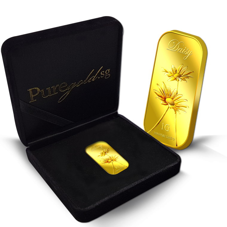 The image is embossed on a 1 gram 999.9 fine gold bar.